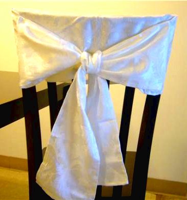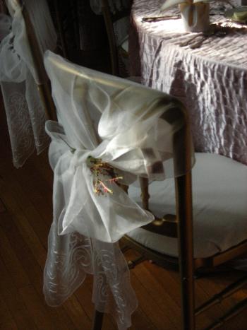 No hace falta más que cubrir la parte superior de la silla con la tela y anudarla a ella misma o fijarla con alambres decorativos de floristería. ¿Qué os parece?